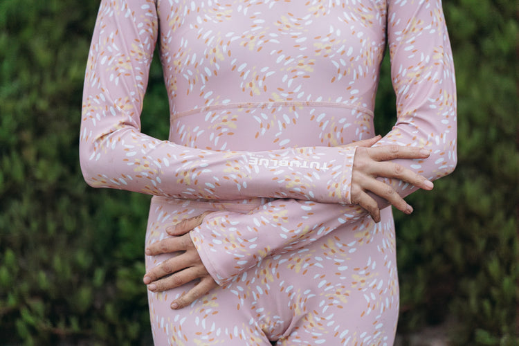 We designed our long swimsuits with thumb holes, full chest and back coverage, and a long zipper in the back for easy changing!